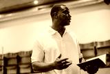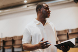 A confident professional speaking in a modern environment, gesturing while holding a notebook and pen. This image captures a dynamic moment of effective communication and engagement.