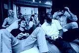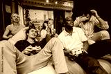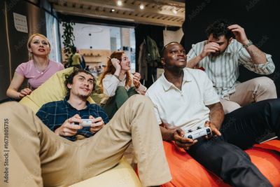 A group of individuals, seated on colorful chairs, are immersed in a gaming session with controllers in hand, sharing excitement and camaraderie.