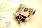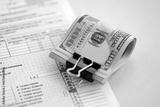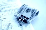Big amount of United States USD dollar bills banknotes on table with 1040 tax return form