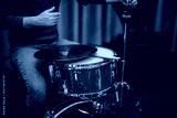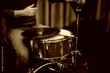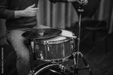 A detailed view of a red drum kit's snare drum, sticks, and cymbal in a room.