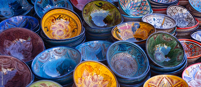 Moroccan ceramic plates, traditional pottery and market culture, local shop in Marrakech’s Medina, vibrant souks filled with traditional Moroccan detailed patterns and cultural artistry