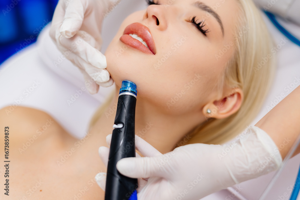 A young woman undergoing a hydra peeling procedure at a beauty salon. Concept skin care for achieving a healthy and glowing appearance.