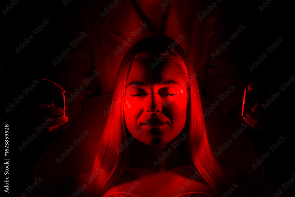 A young woman undergoing cryotherapy, lying under red light rays in a cosmetic center. Concept skin restoration and rejuvenation using advanced technologies.