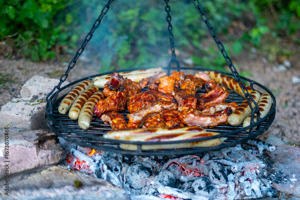 BBQ Pork ribs, meat, and sausages grilling over open fire, barbecue camping cooking, smoky flavor, outdoor feast, rustic adventure lifestyle, outdoor feast, rustic evening light, nature experience