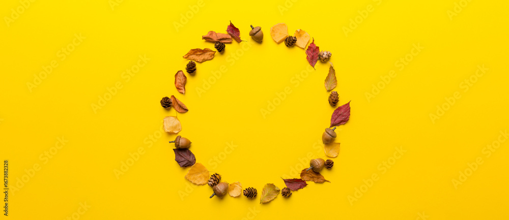 Autumn composition made of dried leaves, cones and acorns on table. Flat lay, top view