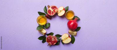 Rosh hashanah concept. Frame made of symbols jewish New Year holiday Traditional. Top view with copy space