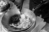 Chef stir-frying rice noodles with shrimp and herbs in a wok. Asian street food preparation with gloved hands and metal spatula over a hot burner