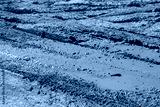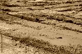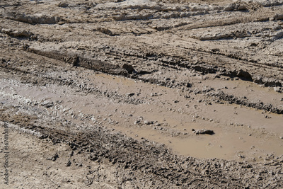 Muddy road with deep vehicle tracks after heavy rain and melting snow, Deep tire tracks in wet, muddy slush, Muddy terrain with tire impressions, challenges of off-road environments