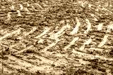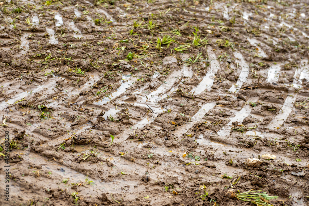 Muddy road with deep vehicle tracks after heavy rain and melting snow, Deep tire tracks in wet, muddy slush, Muddy terrain with tire impressions, challenges of off-road environments