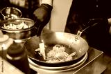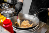 Chef cooking stir-fried noodles with chicken and onions in a wok. Steam rises as food is mixed with a spatula. Condiments and chopped onions visible in foreground