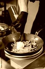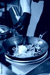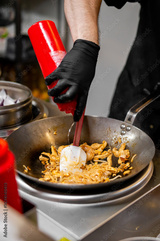 Chef stir-frying noodles in wok, adding sauce with red squeeze bottle. Gloved hand, white spatula, professional kitchen setup. Asian street food preparation concept