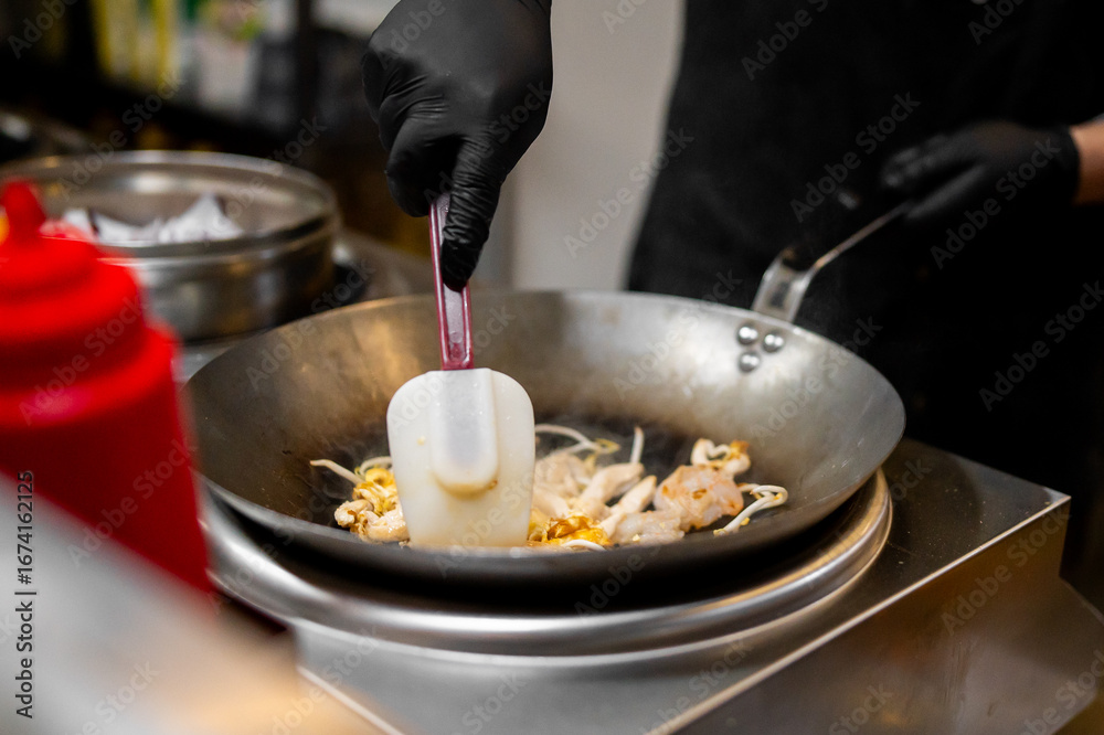 Chef cooking stir-fry in wok with spatula and gloves in commercial kitchen. Ingredients include meat and bean sprouts. Professional food preparation scene