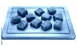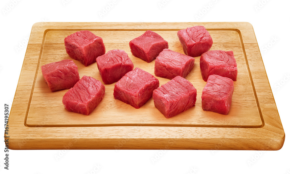 tábua de servir com cubos de carne bovina cru isolado em fundo transparente