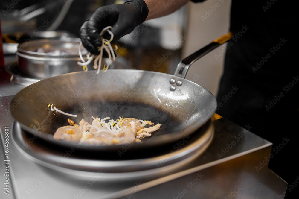 Chef cooking stir-fry in wok with chicken and bean sprouts in a commercial kitchen. Steam rises as fresh ingredients are added, showcasing dynamic food preparation