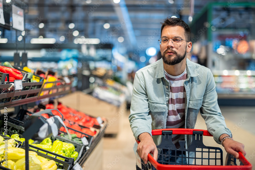 Man Shopping for Fresh Produce in a Modern Supermarket
