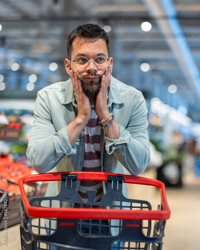 Confused Man Contemplating Purchase While Shopping in Grocery Store