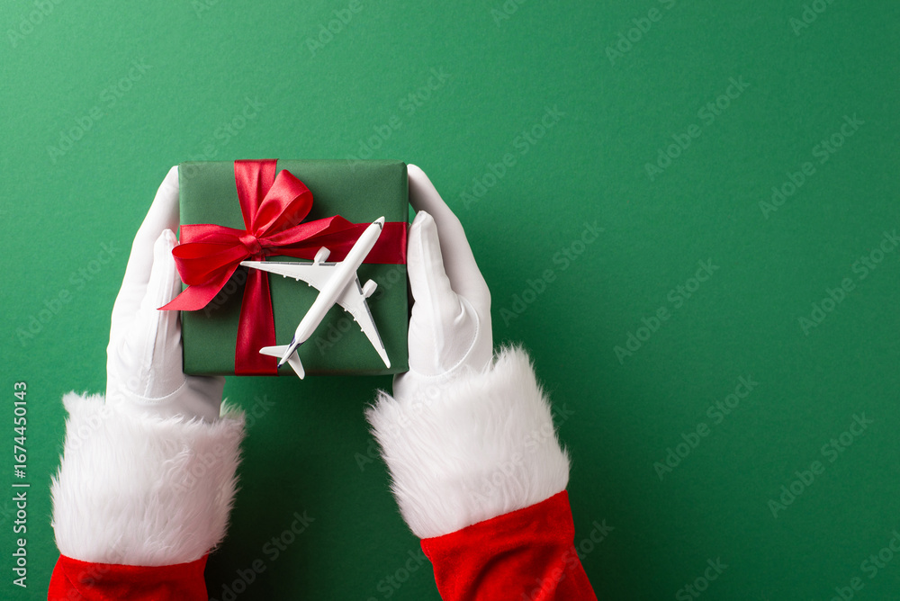 Santa's hands holding a wrapped present with a toy airplane, symbolizing holiday travel and gifting