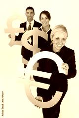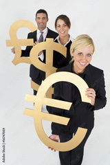 Businesswoman and Team With Currency Symbols Euro Dollar and Pou