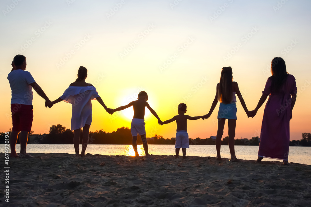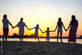 Family gathered at the beach holding hands as the sun sets over the water in summer