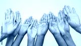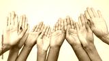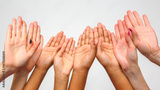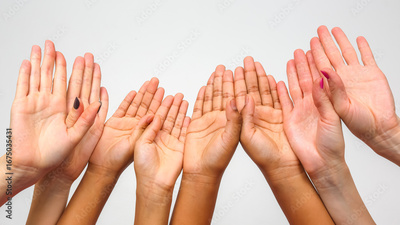 Diverse hands raised in unity showcasing different skin tones and gestures of inclusion