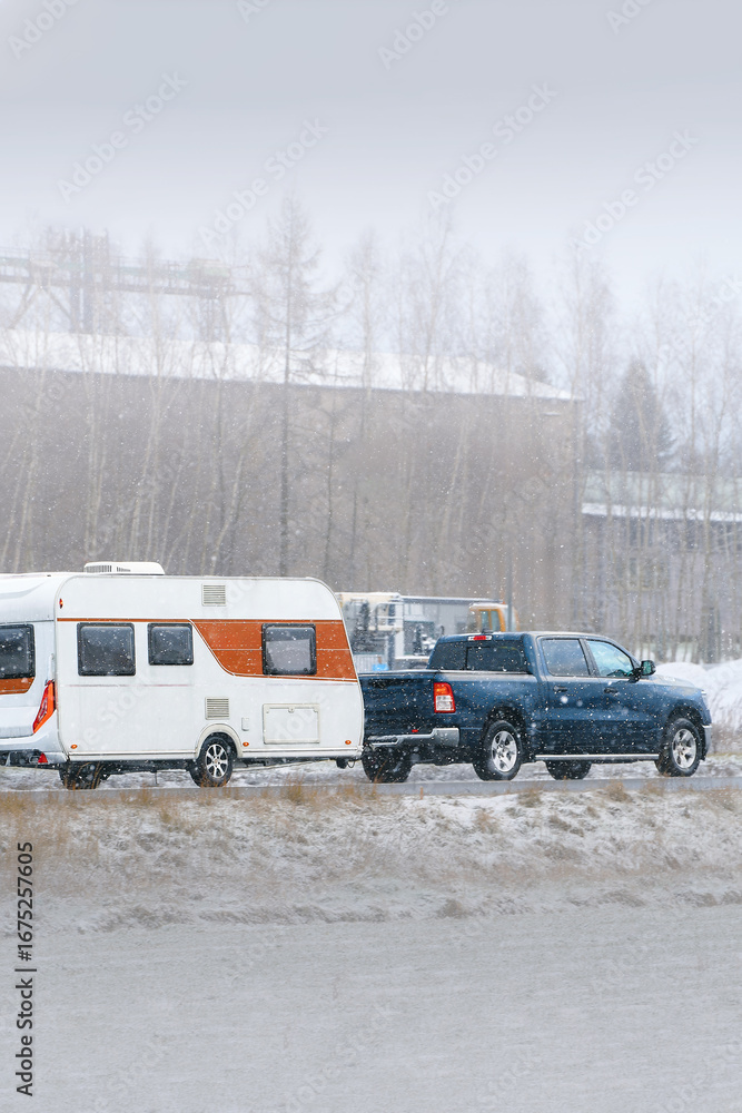 Pickup truck pulling camper trailer snowy road