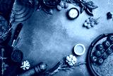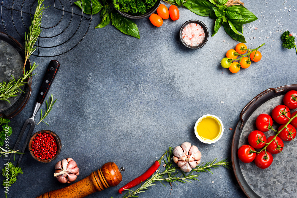 Gray stone table and cooking background. Spices and vegetables. Top view. Free space for your text.