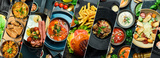 Background of food dishes and snacks. Photo collage, banner from photos.