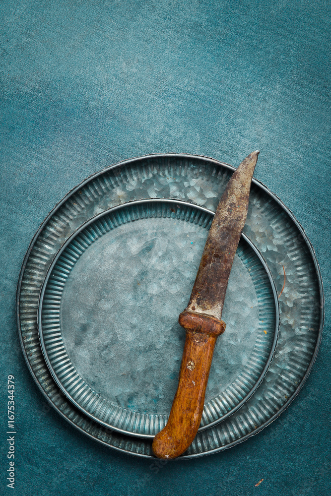 Kitchen knife on a metal plate or tray. On a concrete background. Top view.
