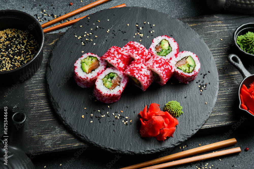 Sushi roll with caviar, salmon and avocado. Asian cuisine. Close up. Free space for your text.