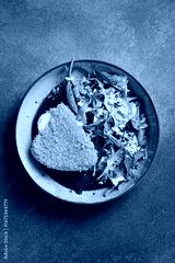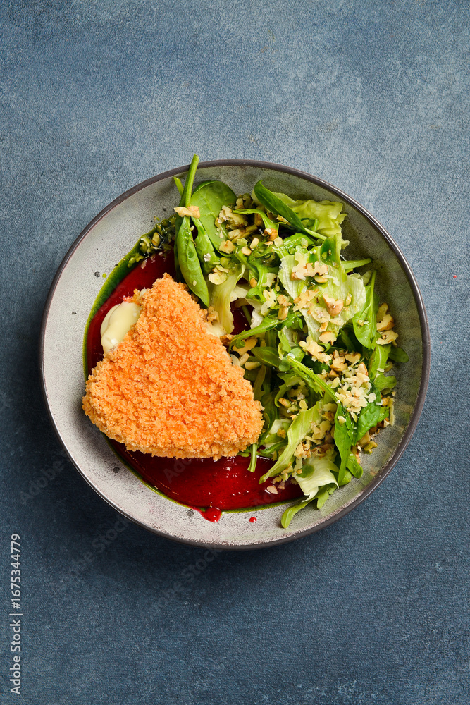 Grilled camembert cheese with vegetables and blackberry sauce. Close up.