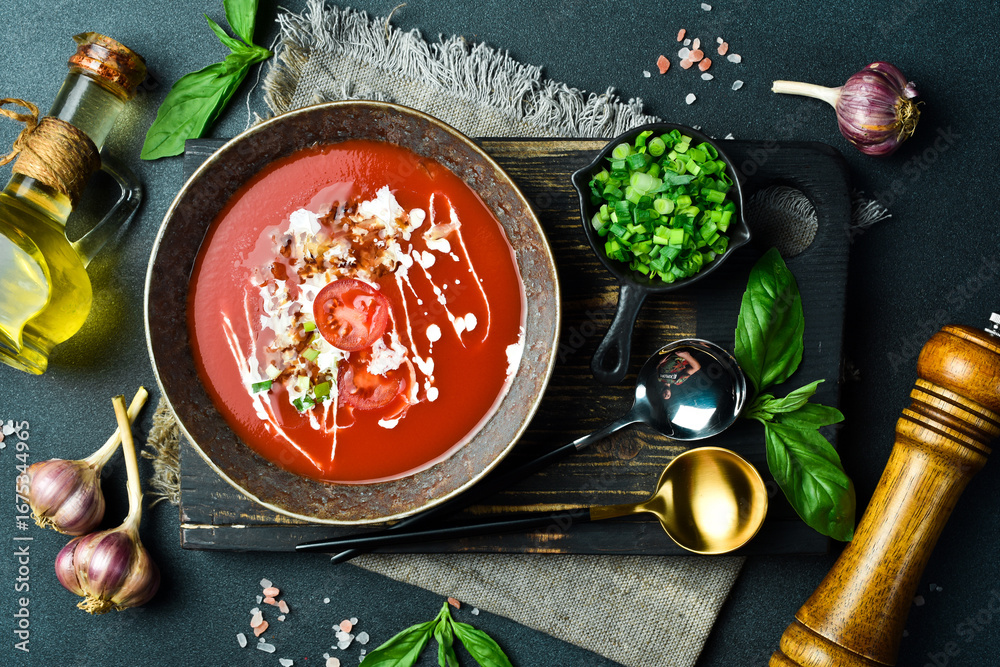 Tomato soup with basil and cream. In a bowl. Healthy food concept. Close up.