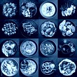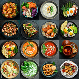 Photo collage of food in plates. Dishes from Meat, Seafood and Vegetables. Top view on black background. Square image for social media.