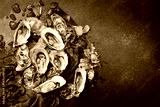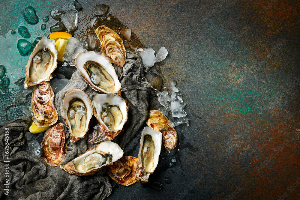Open fresh oysters on a dark table. Healthy seafood. French Oyster dinner in restaurant. Seafood, gourmet food. Flat lay.