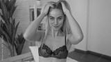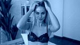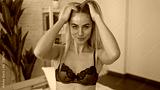 Woman seated on a white bed lifts hair with both hands in a bright bedroom with a green plant and white brick wall showing black lace bra; confidence.