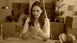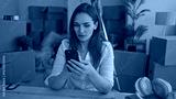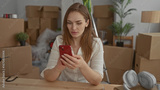Woman holds smartphone during unpacking as moving boxes fill the room in new building; fresh start excitement.