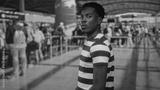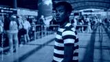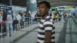 Young african american man looking over shoulder while standing at crowded airport terminal queue; anticipation.