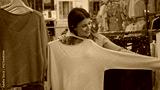 Woman shopping at street market examines sweaters with a smile showcasing hispanic beauty in a vibrant shop setting.