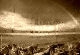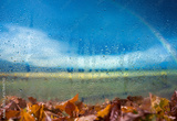 Raindrops on Window with Autumn Leaves and Rainbow in Background
