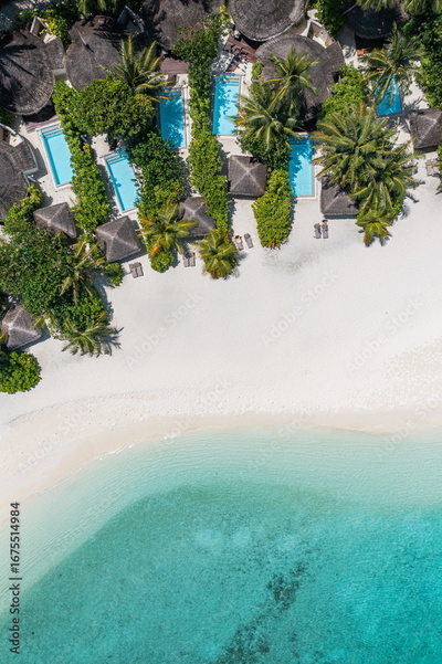 Amazing Maldives resort beach villas pools aerial landscape sunny tropical island blue sea stunning scenic background summer vacation paradise luxury travel destination tourism gorgeous escape