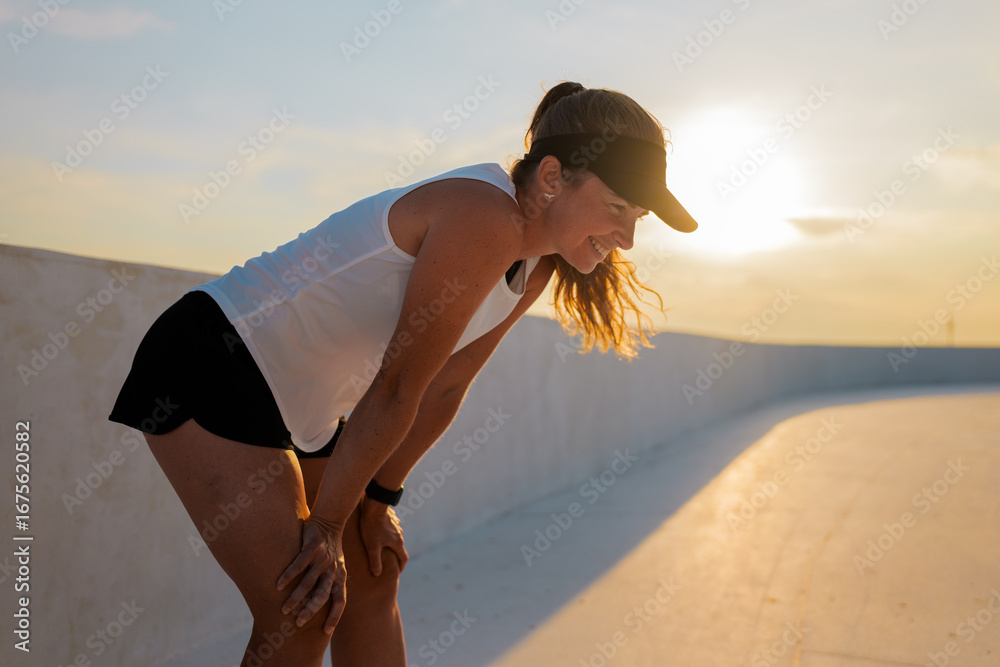 Sweat and determination shine bright as a runner takes a well-deserved break by the waterfront