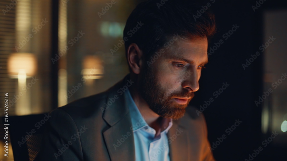 Serious director working late portrait. Nervous employee gesturing hands evening