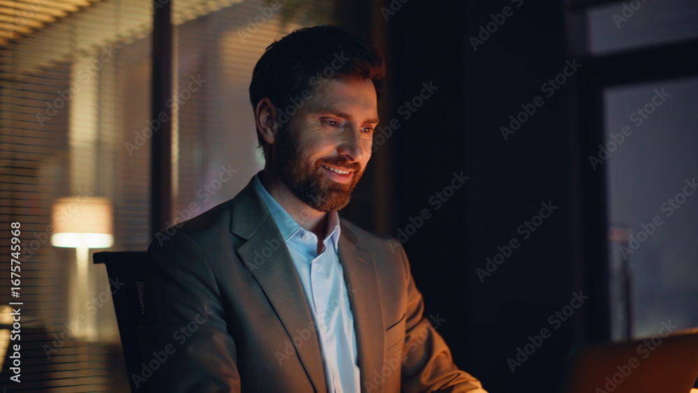 Manager hands texting computer night office closeup. Smiling businessman working