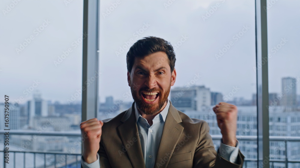 Business owner rejoicing achievement at city view window closeup. Man winning