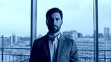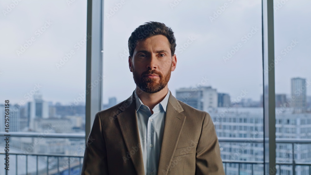 Confident businessman posing cityscape building closeup. Employee crossing arms