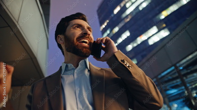 Overjoyed company owner calling smartphone rejoicing on evening street closeup
