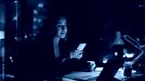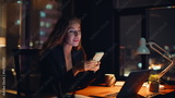 Smiling businesswoman using smartphone messaging sitting dark office closeup