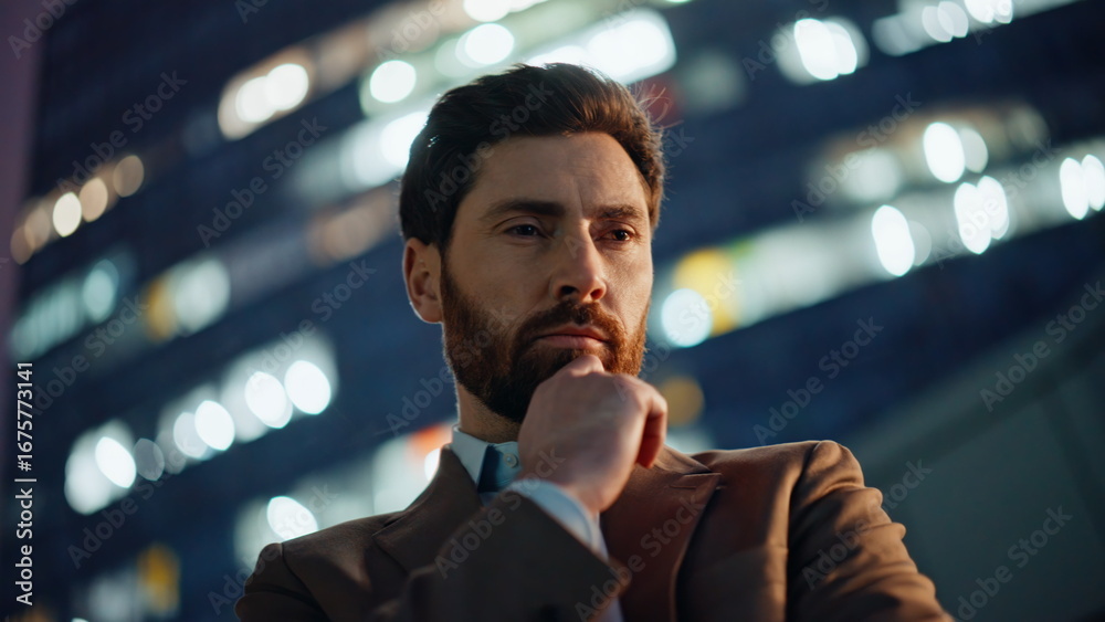 Thoughtful businessman standing evening street portrait. Boss thinking career
