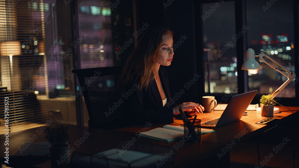 Emotional businesswoman rejoicing success looking laptop dark workplace closeup