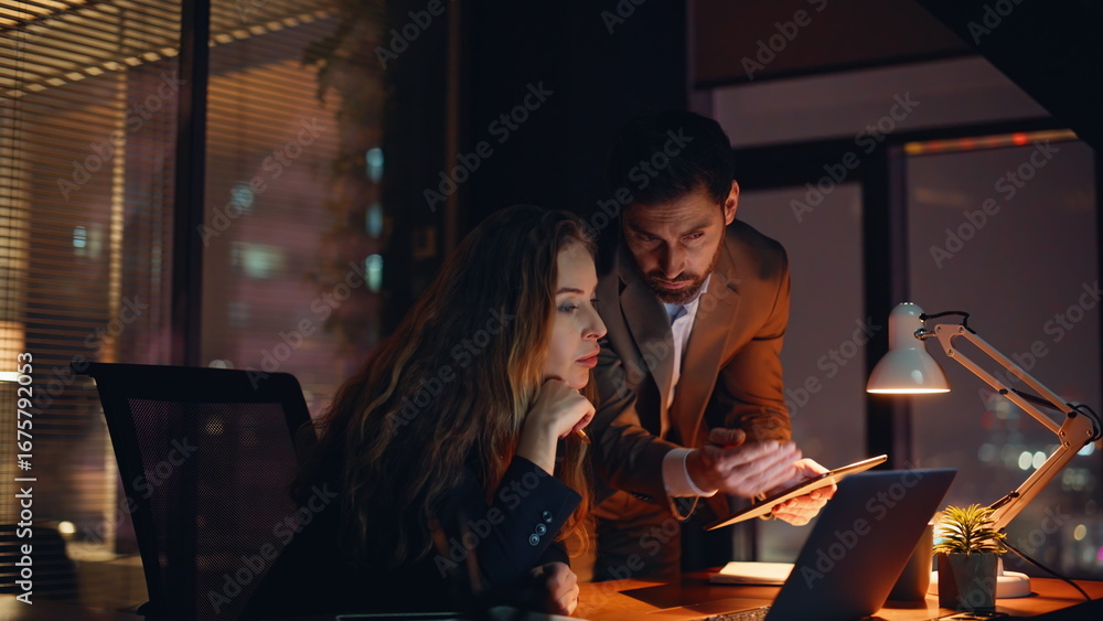 Young entrepreneurs analyzing goals night shift in dark office watching screen
