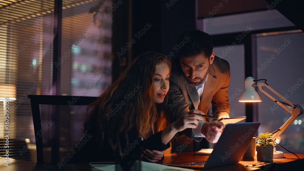 Two coworkers collaborating together business project. Colleagues looking laptop